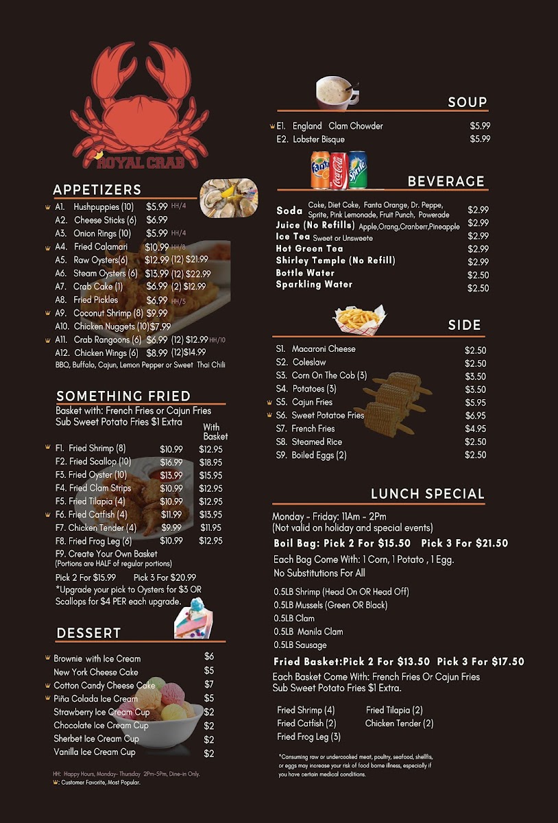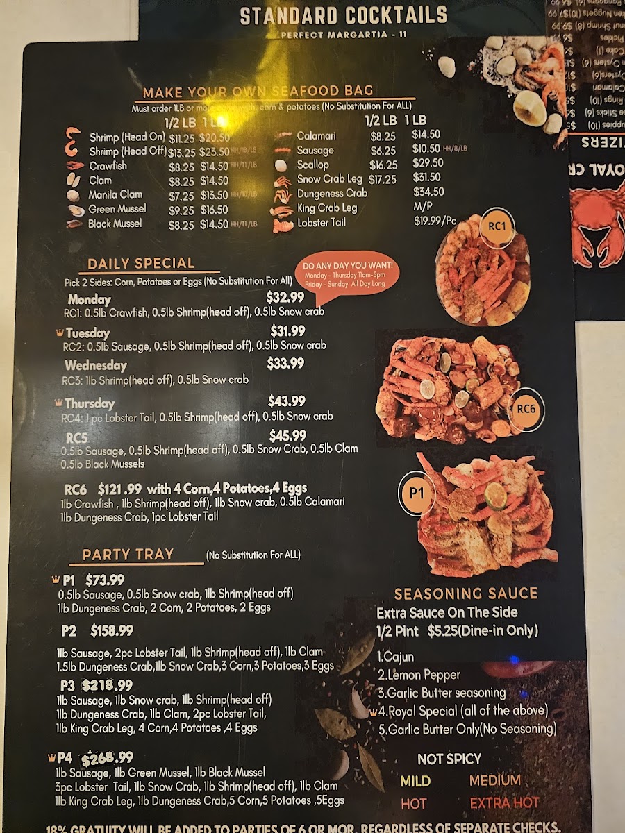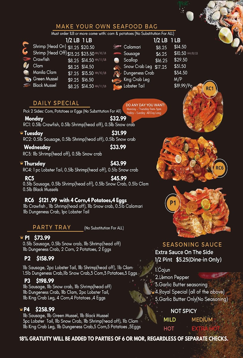Introducing Royal Crab, the latest gem in Oklahoma City's seafood scene, located at 3031 W Memorial Rd. This establishment specializes in seafood boils and offers a menu that celebrates freshness and flavor. Diners can indulge in a selection of delightful combinations, such as the 0.5 lb shrimp with sausage, corn, potato, and egg for just $14.99, or the black mussels paired with shrimp for $16.99.